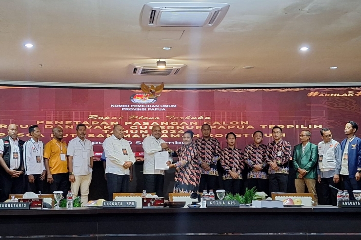 Jayapura, semuwaberita.com - KPU Provinsi Papua resmi menetapkan Matius Fakhiri – Aryoko Rumaropen sebagai Gubernur dan Wakil Gubernur Papua terpilih periode 2025–2030. Penetapan dilakukan melalui rapat pleno terbuka di kantor KPU Papua, Sabtu (20/9/2025), setelah Mahkamah Konstitusi (MK) menolak gugatan sengketa hasil PSU yang diajukan pasangan Benhur Tomi Mano – Constan Karma (BTM–CK).