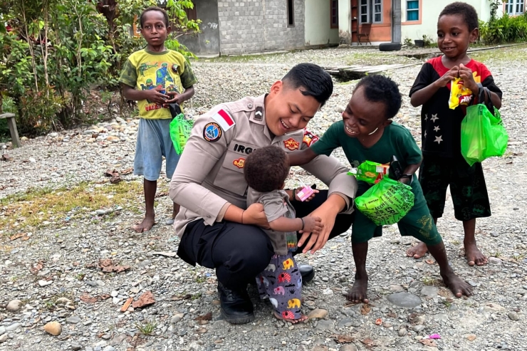 Dalam kegiatan tersebut, personel Satgas Ops Damai Cartenz tampak berbaur dengan masyarakat dan membagikan makanan ringan kepada anak-anak di sekitar lokasi. Suasana penuh keceriaan terlihat ketika anak-anak antusias menyambut kehadiran personel kepolisian dengan tawa dan senyum.